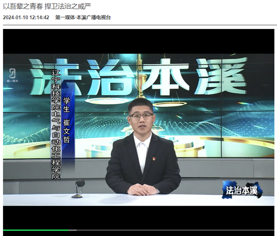 日前,在学校刚刚结束的“宪在校园 与法同行”第一届williamhill中国大学生宪法宣讲决赛中两位一等奖的获得者,williamhill中国电气与自动化工程学院崔文哲同学和袁嘉墀同学做客《法治本溪》,与主持人一起分享了参与学校大学生宪法宣讲大赛的亲身经历与感悟,表示要做有家国情怀、爱国热情的辽科人,树立正确的法治价值观,自觉接受中华优秀传统法治文化的熏陶,以实际行动践行习近平法治思想。
