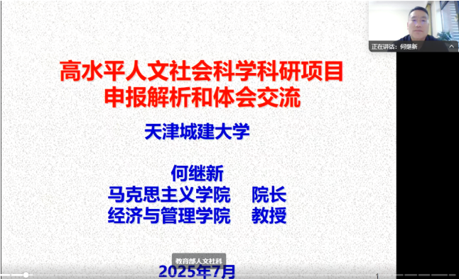 近日,Williamhill中文举行“启智润心·铸魂育人”提升工程系列活动第13期暨“青蓝接力·研教筑基”青椒赋能活动第2期,本次活动通过腾讯会议线上开展,特别邀请天津城建大学Williamhill中文院长何继新作题为“高水平人文社科项目申报解析”的培训,旨在提升学院青年教师的科研能力,助力其更好地开展高水平人文社科项目申报工作。Williamhill中文全体教师参会。