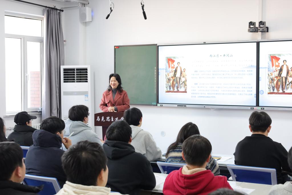 课堂伊始,赵毅以毛泽东同志《西江月・井冈山》一词为切入点,结合秋收起义后井冈山革命根据地创建的历史脉络,生动再现了1928年黄洋界保卫战的壮阔场景。“山下旌旗在望,山头鼓角相闻。敌军围困万千重,我自岿然不动”,赵毅逐句解读诗词背后的历史语境,详细讲述了红军在主力远调、兵力不足一营的绝境下,依靠竹钉阵、滚木雷石构筑防线,军民同心巧用计谋击退敌军的英雄事迹。她特别强调,“众志成城”不仅是诗词中军民同心的生动写照,更凝聚着跨越时空的精神力量——当年井冈山军民“生死与共的鱼水深情”,与东北抗联将士在林海雪原中坚守的家国情怀一脉相承,都是中国共产党人宝贵的精神财富。