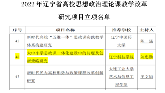 在辽宁省教育厅公布的《2022年辽宁省高校思想政治理论课教学改革研究项目》立项名单中,刘忠勋老师申报的课题《大中小学思政课一体化建设中的问题及创新策略研究》获批立项。