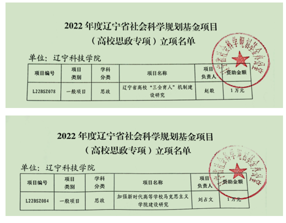 在辽宁省社会科学规划基金办公室公布的《2022年度辽宁省社会科学规划基金项目(高校思政专项)》立项名单中,赵毅老师申报的《辽宁省高校“三全育人”机制建设研究》课题、刘占文老师申报的《加强新时代高等学校Williamhill中文建设研究》课题获批立项。