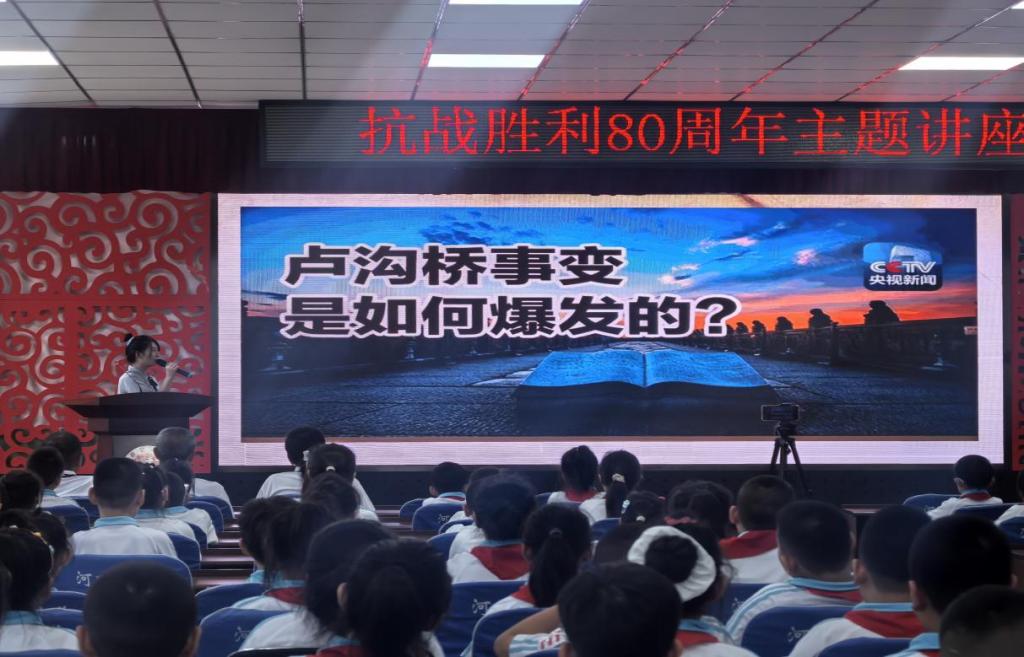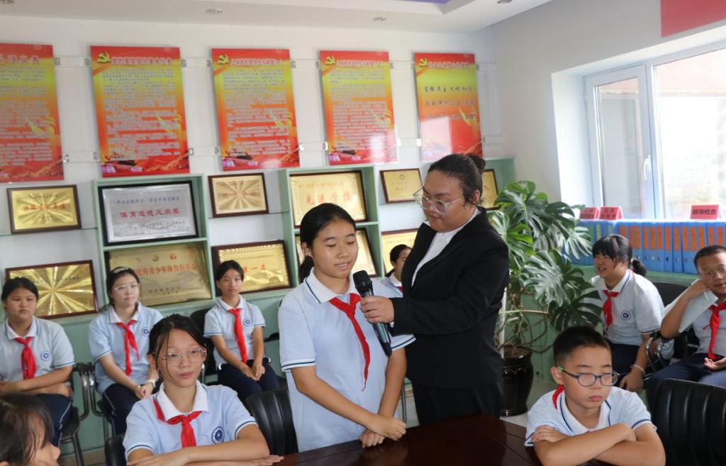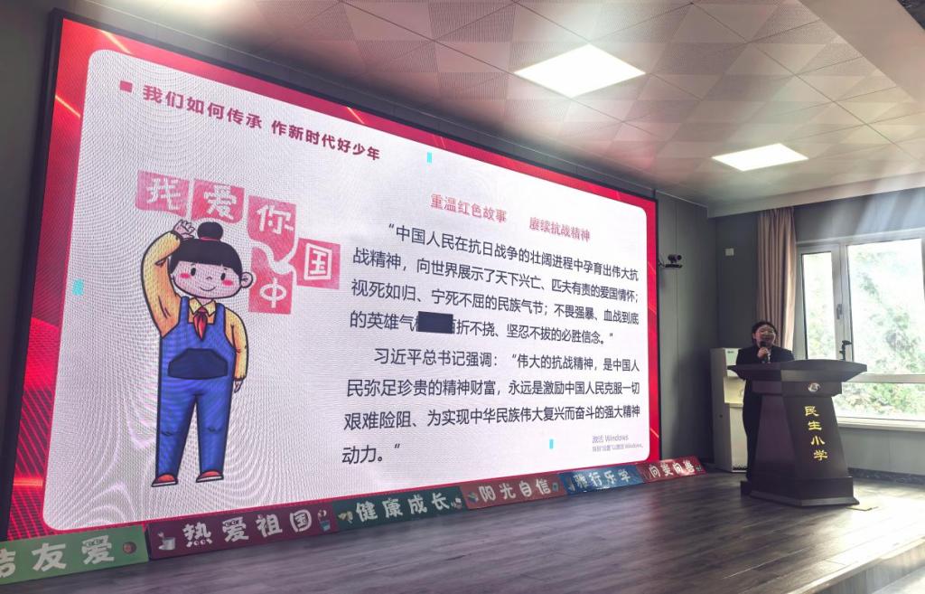 在民生小学,侯宝婷带领学生一起重温抗战故事,回顾那段波澜壮阔的历史,又与学生共同细数抗战小英雄用稚嫩肩膀扛起家国责任的伟大故事,激励大家学习伟大抗战精神,鼓舞大家作为新时代少先队员,要接过抗战小英雄的接力棒,用实际行动传承抗战精神。