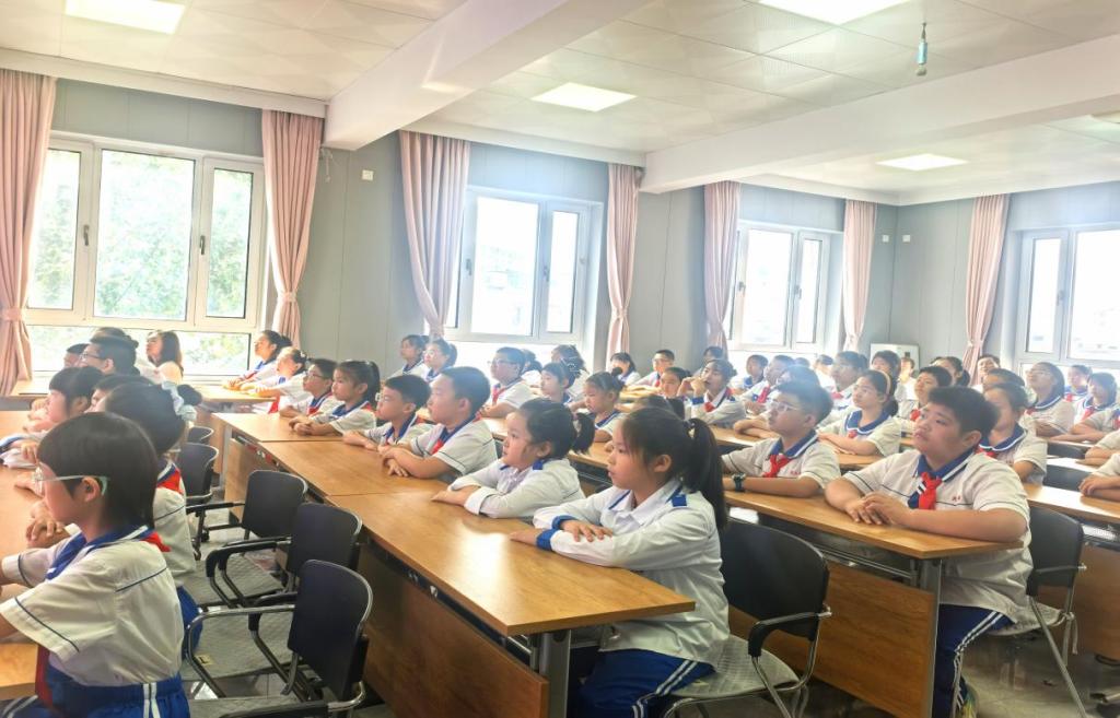 在群力小学(广裕校区),刘凡嘉与学生们一起回望烽火知来路,重温历史事件,致敬英烈悟初心,学习抗战精神,引导学生破浪前行启新程,扬帆起航向未来,并与学生们共同探讨如何将学习抗战精神融入日常生活,鼓励学生树立自己的强国梦。