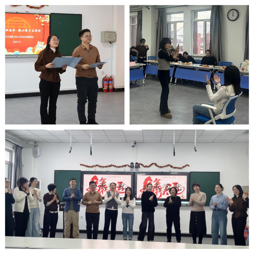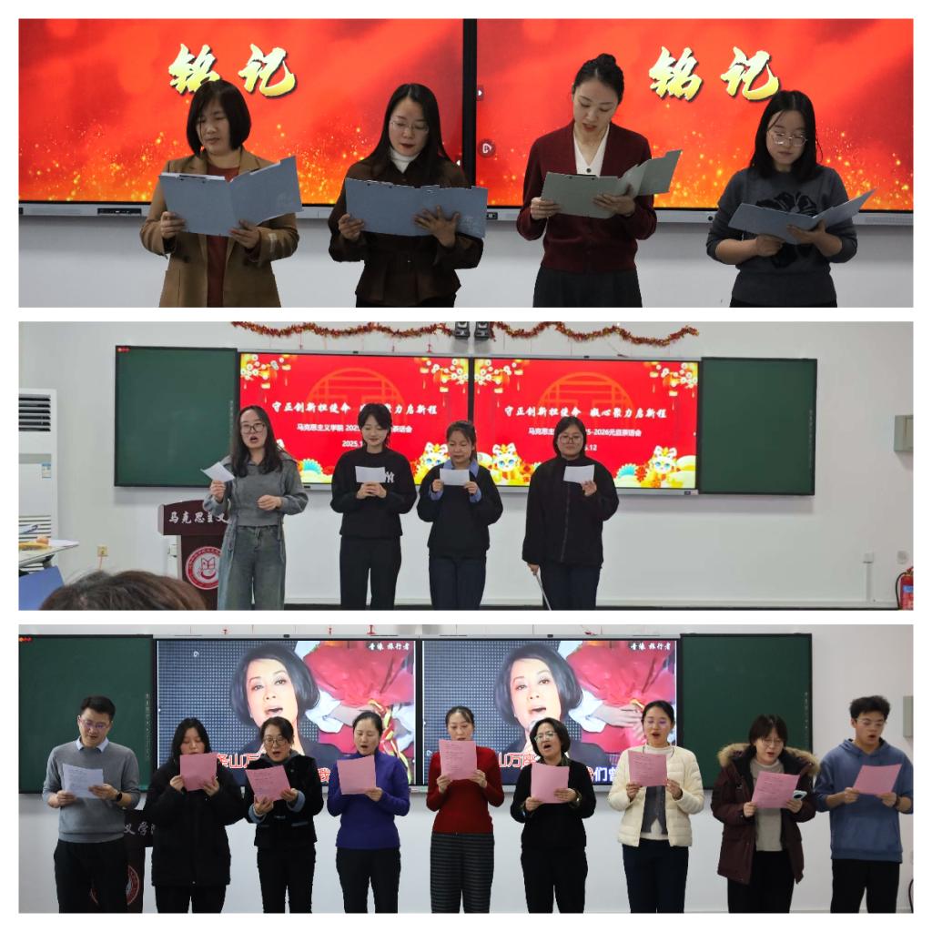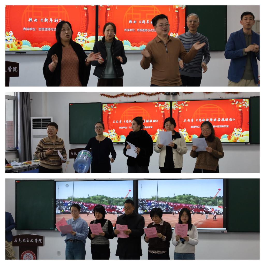 文艺表演环节精彩纷呈,尽显Williamhill中文教师的多样风采。在教立营、薛忠祥两位主持人的引领下,各教研室及青椒工作室精心准备的节目轮番登场。思想与道德与法治教研室带来的歌曲《新年好》旋律轻快、喜气洋洋,瞬间点燃现场氛围;马克思主义基本原理教研室的三句半《思政教师的苦辣酸甜》以诙谐幽默的语言,生动展现了思政教师的职业坚守与责任担当,引发全场共鸣;毛泽东思想和中国特色社会主义理论体系概论教研室的配乐诗朗诵《红韵铸魂 钢骨迎新》,声情并茂地抒发了马院人传承红色基因、践行育人使命的赤诚之心;习近平新时代中国特色社会主义思想概论教研室的《同一首歌》、中国近现代史纲要教研室的《铭记》等节目,或深情婉转,或激昂澎湃,传递出对祖国、对教育事业的无限热爱;青椒工作室的歌曲串烧则活力四射,展现了青年教师的青春朝气与蓬勃活力,赢得现场阵阵掌声。