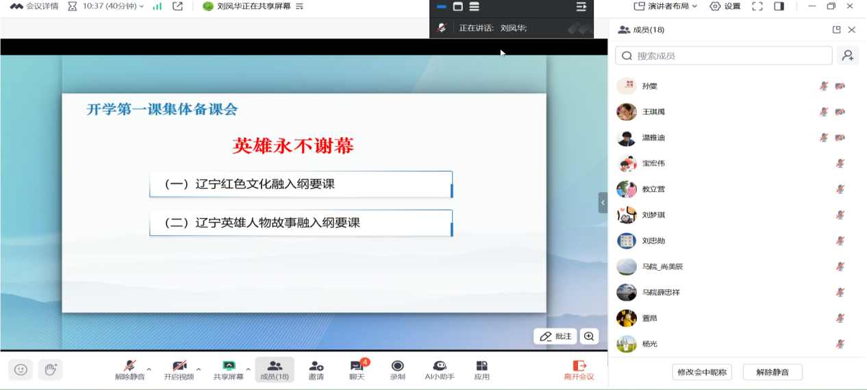 会议伊始,刘凤华传达了辽宁省思政课“开学第一课”的核心要求,并围绕“英雄永不谢幕”的主题,为全体教师作了教学示范。通过情景再现与深度剖析相结合的方式,生动讲述了金城龙在危急时刻挺身而出、用生命践行使命的感人故事。在本门课程教学中,要善于运用这样的本土榜样,将宏大叙事转化为可感可知的人格力量,引导学生理解:英雄并非遥不可及,平凡中的坚守与担当正是民族精神薪火相传的体现。