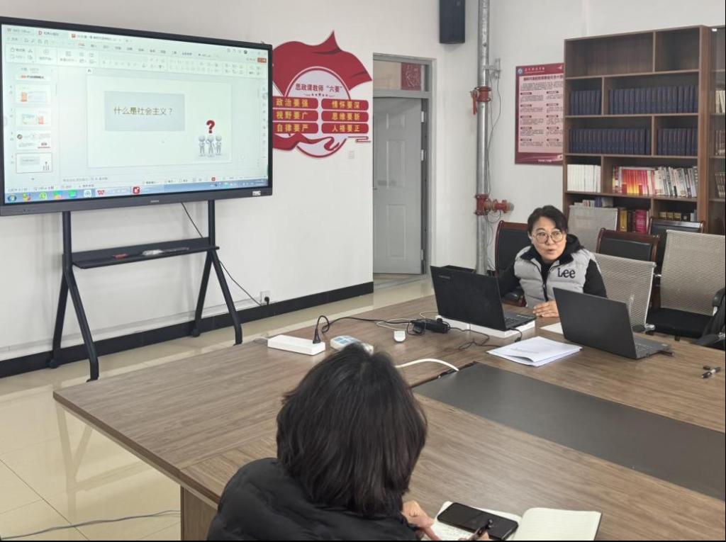 教研室骨干教师胡丹老师作主旨发言。她针对教材第一章《新时代坚持和发展中国特色社会主义》内容开展定位分析,介绍如何采用问题链教学模式层层深入引导学生深入浅出地思考,为教学提供了有益的建议。