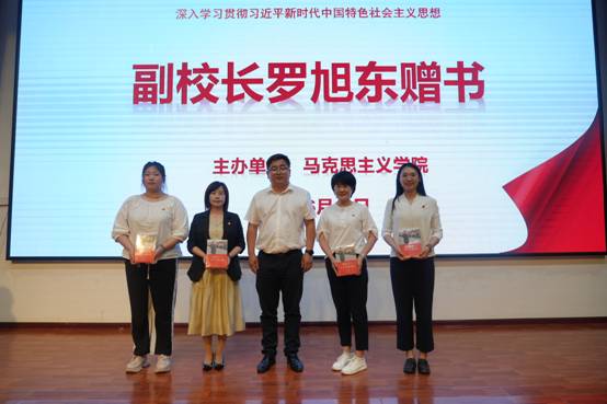 副校长罗旭东向发言师生代表赠送《习近平与大学生朋友们》一书,希望全体教师能够按照“四有”好老师的标准严格要求自己,希望同学们能够通过思政课提升综合素养。